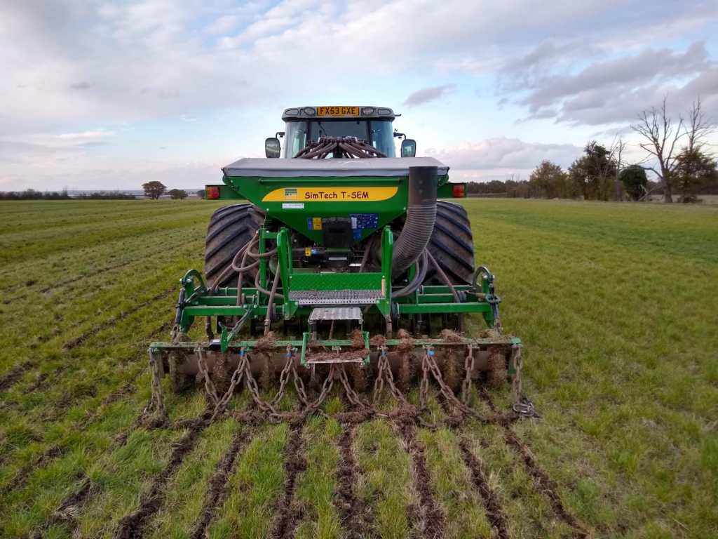 Once the straw is evenly distributed across the field we then go straight into the stubble with the drill without disrupting the soil or the organisms within. We have tried various different drills over the years but we prefer to use out lightweight tractor and 3m SimTech drill which opens up an “inverted T” in which the seeds are sown. We have found that this is the best drill for us as it does not suffer the blockages from the straw that we have previously struggled with.