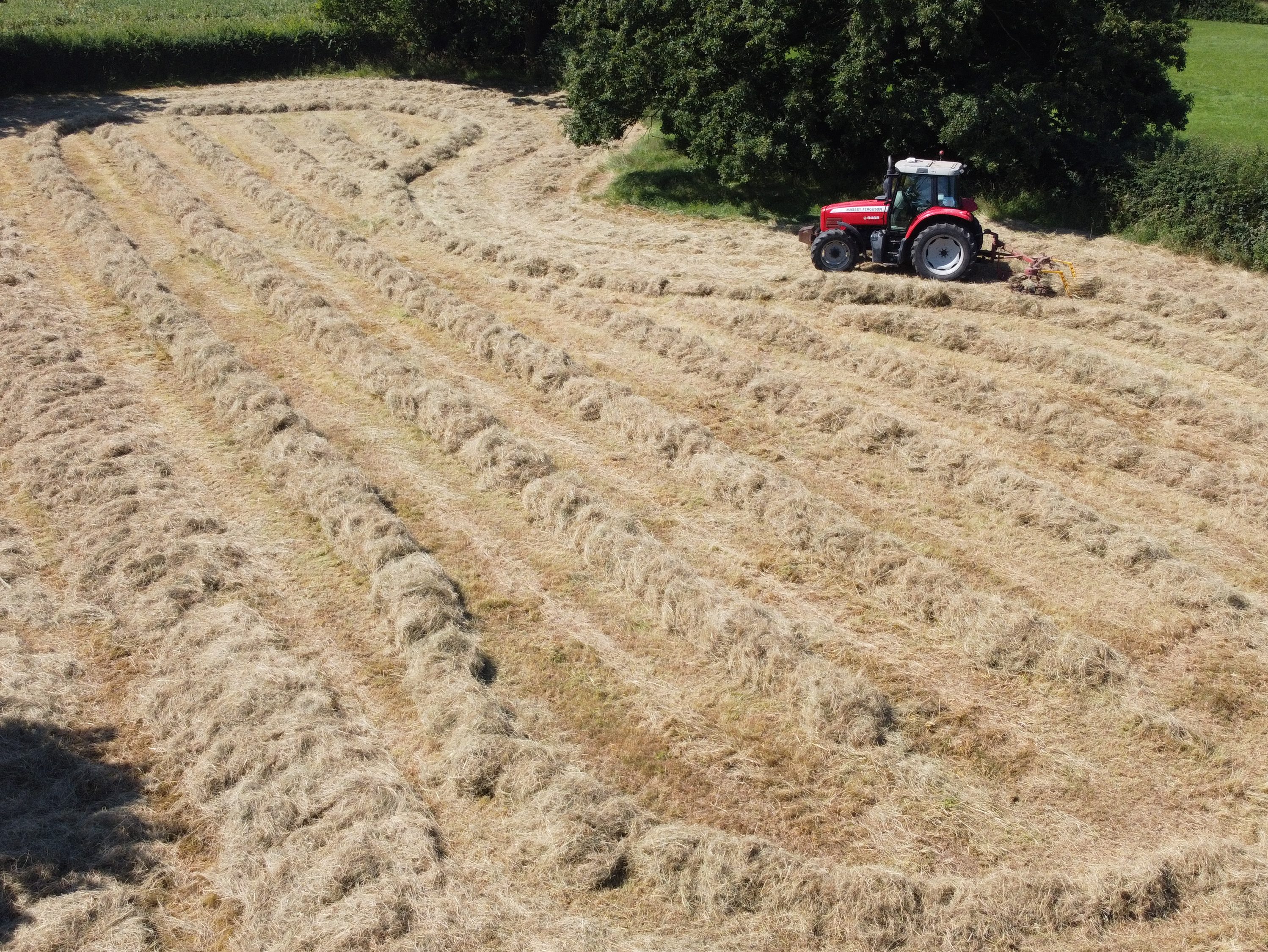 Firstly we cut the grass with a hay mower, which cuts it off at the floor and lays it down while leaving the grass long. From here we spread the grass to allow it to dry evenly. This is done a few times dependent on how dry the grass is to start with and what happens with the weather. Once we are happy with the moisture levels it gets rowed back up ready to be baled.
